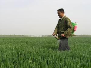 受国家和农场各项惠农政策的鼓舞,潘村湖农场广大 职工家庭农场种粮积极性空前高涨.目前,全场3.2万 亩小麦长势喜人,丰收在望.4月中旬以来,农场职工 按照场农技部门的指导,积极开展小麦生长中后期的 田间管理工作.图为五分场职工阚兵正在自家的责任 田实施小麦叶面喷肥的情景.(杨登宏摄)
