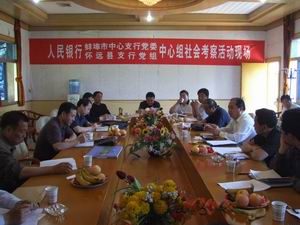 5月23日,人民银行蚌埠市中心支行党委、怀远县 支行党组蚌埠市分行仇行长率中心组在龙亢农场举 行社会现场考察活动,考察我场社会主义新农村建 设情况、以及金融机构如何在我场社会主义新农村 建设中发挥作用等,来自人民银行蚌埠市支行、人 民银行怀远县支行、中国农业银行蚌埠市支行、中 国农业银行怀远县支行、中国农业发展银行怀远县 支行、徽商银行怀远县支行、怀远县信用联社,以 及县农委等单位的行长、负责人参加了现场考察活 动。场长、党委书记杨俊宇、副场长李应河等同志 给予了热情接待。