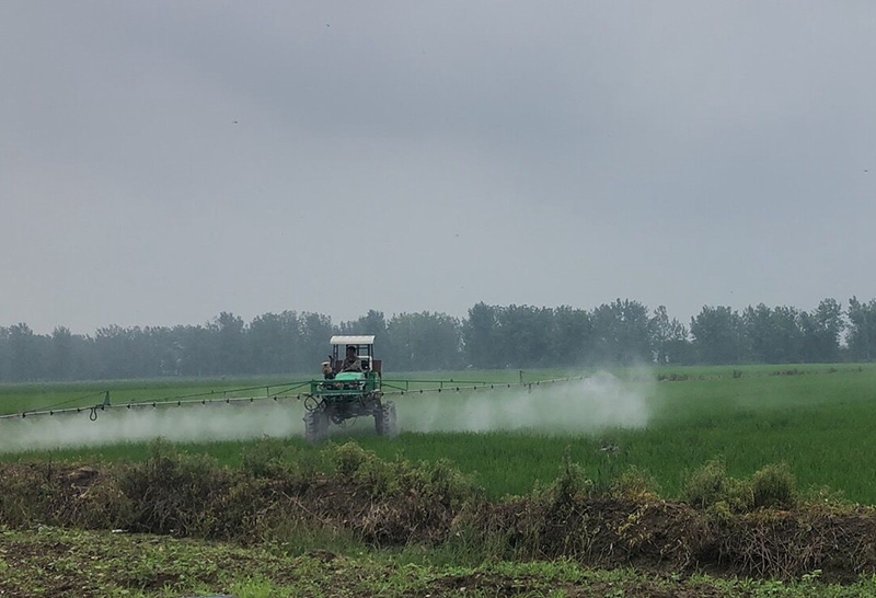近日,淮南农场公司针对1.67万亩在地作物受灾不同等级及长势情况,印发了3期病虫情报和5期技术明白纸,积极动员家庭农场抢抓短暂晴好天气,见缝插针,做好病虫害的防治和科学肥水运筹等关键农技措施的落实,力求把水灾损失降到最低。图为 7月31日,淮南农场公司规模种植公司在给水稻田间施肥打药。(李超)
