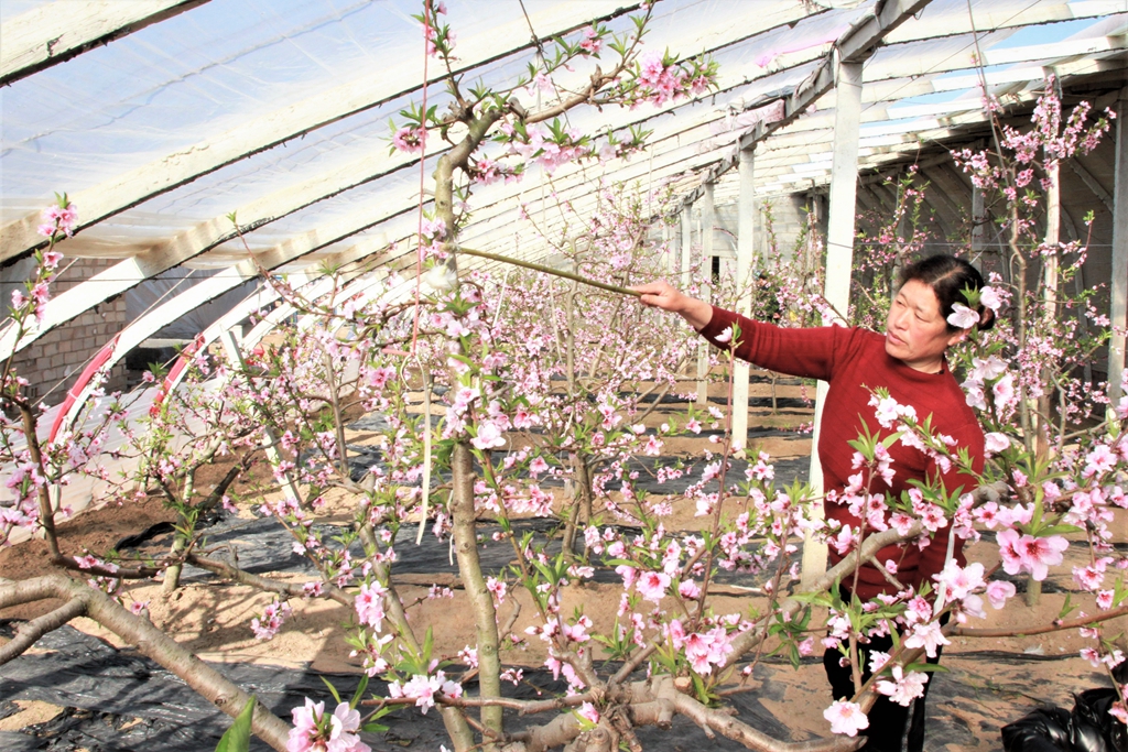砀山果园场果农为桃树授粉(郭 茜 摄)