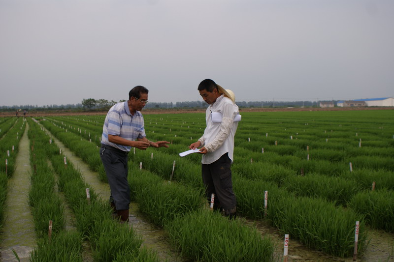 近年来,安徽农垦大圹圩农场通过不断加大科技投入,加强人才引进和与科研单位紧密合作,已有一个优质水稻品种育成并通过省级审定,11个水稻品系进入安徽、江苏等地的区域性试验。今年,该农场农科所试验田夏种的各类水稻育种材料达4700余份,数量较往年有较大幅度的增加。图为著名水稻育种专家、皖垦种业顾问江祺祥(左)在大圹圩农场实地指导水稻育种夏种工作。(