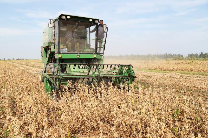 图为华阳河新洲管区用大型收割机收获大豆。(李龙)