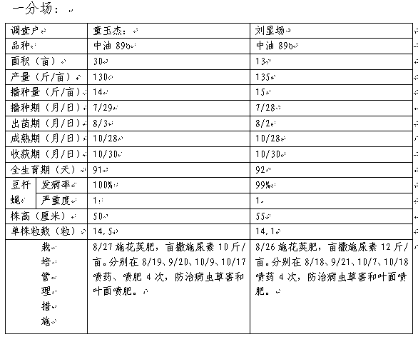 2.由农科所组织2-3名技术人员,定期通过田间观察和职工口述,详细调查补种典型户的生产管理情况和补种大豆生育特点。