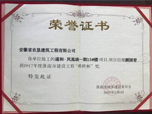 近日,安徽农垦建筑公司承建的“通和·凤凰城”一期13#、15#住宅楼,双双荣获2017年度淮南市建设工程“舜耕杯”奖。